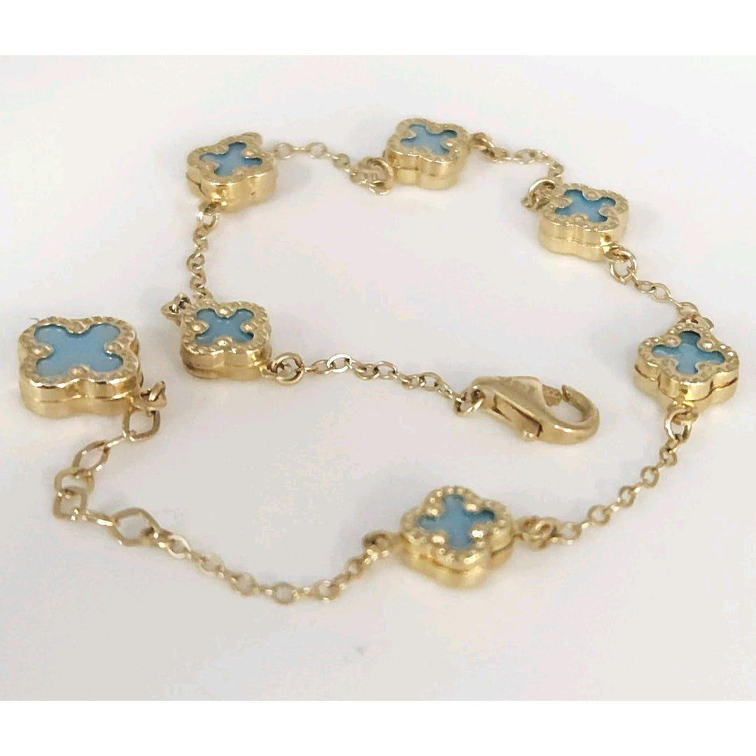 14k Yellow Gold double Face Mother Of Pearl Chain Clover Flower Bracelet 8"