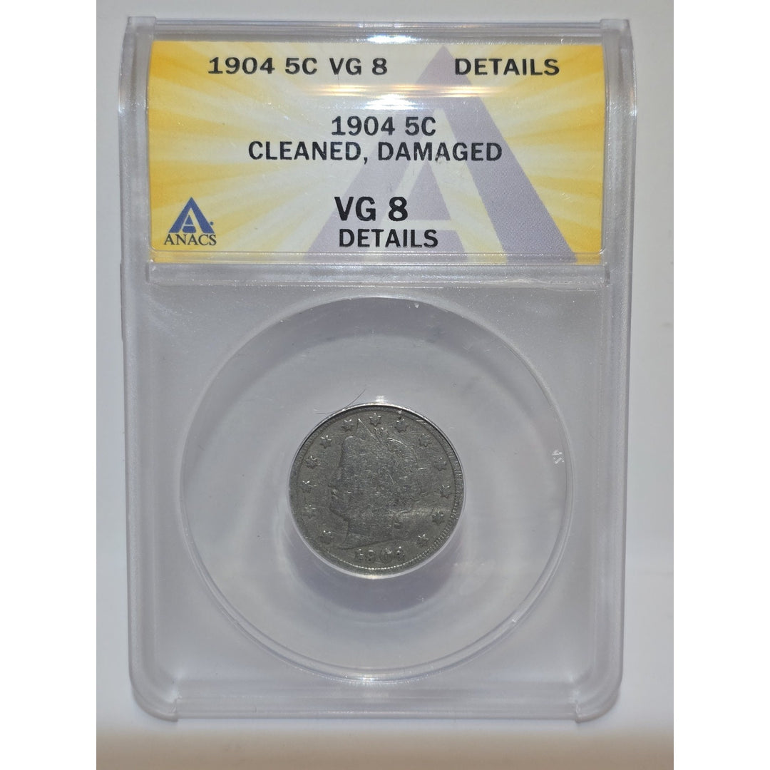 1904 .05 ANACS VG 8 Liberty Nickel, V Nickel, 5 Cent Piece Cleaned Damaged
