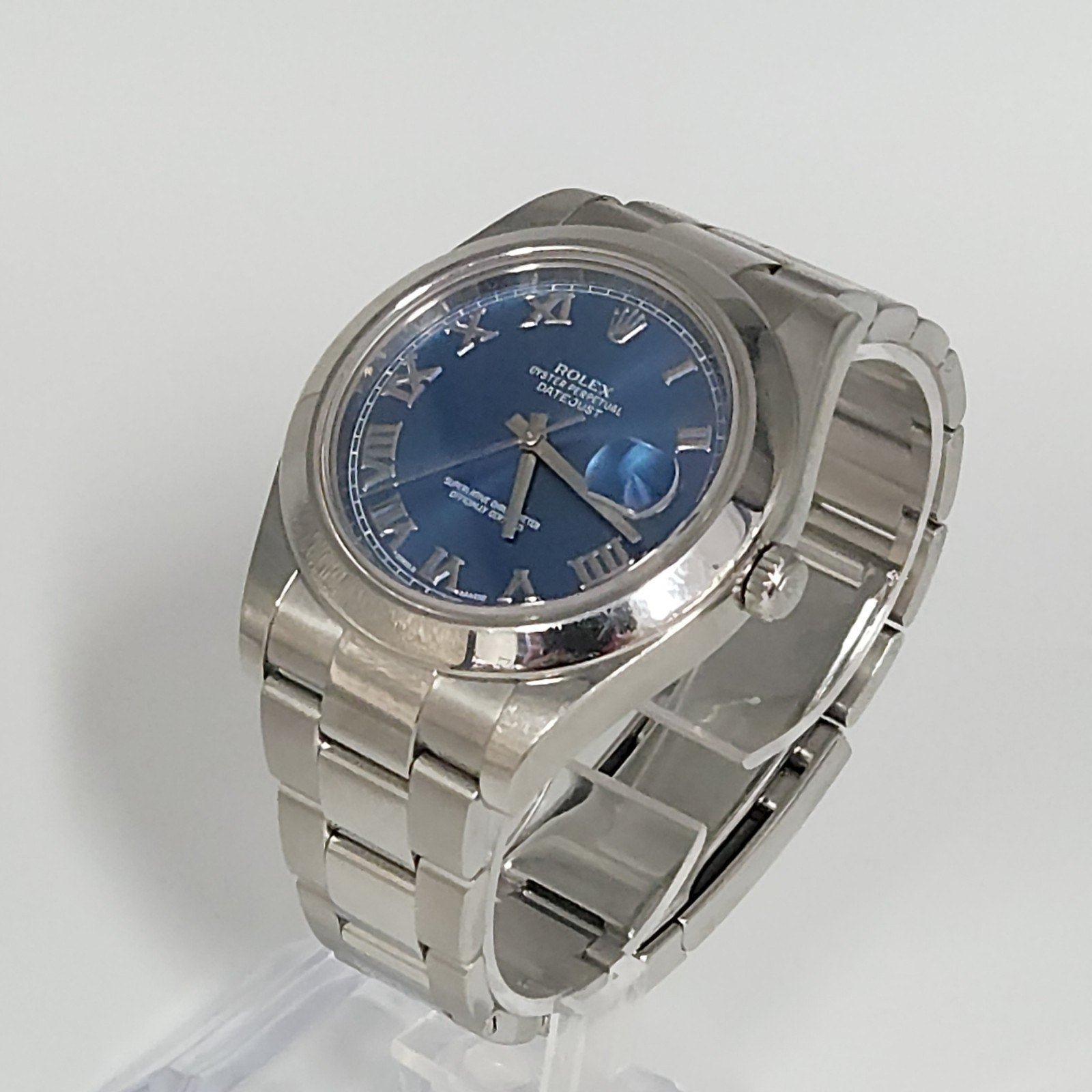 Elevate your style with the 41MM Rolex 116334 Datejust Blue Roman Dial Oyster Bracelet Watch, a seamless blend of luxury and precision timekeeping. Its striking blue dial is complemented by classic Roman numerals, set against a polished stainless steel case and bracelet, offering a sophisticated look for the discerning gentleman. Functionality meets elegance with this mechanical (automatic) wristwatch, featuring a date indicator and the esteemed 'Swiss Made' certification. A perfect accessory for any occasion, from casual outings to formal events, this Rolex Datejust is a testament to enduring style and craftsmanship.