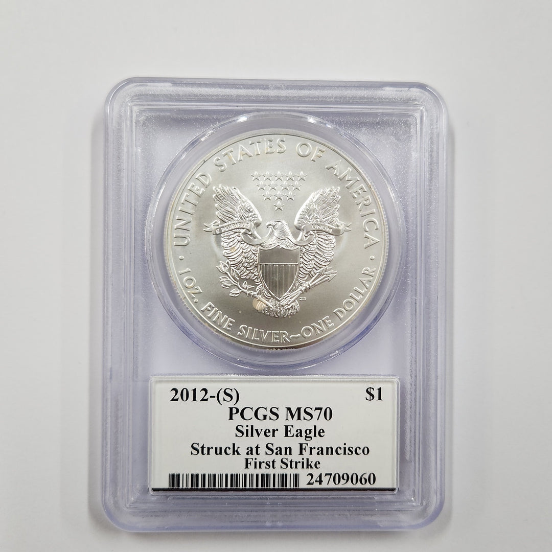 2012-S American Silver Eagle First Strike San Francisco John Mercanti PCGS MS70