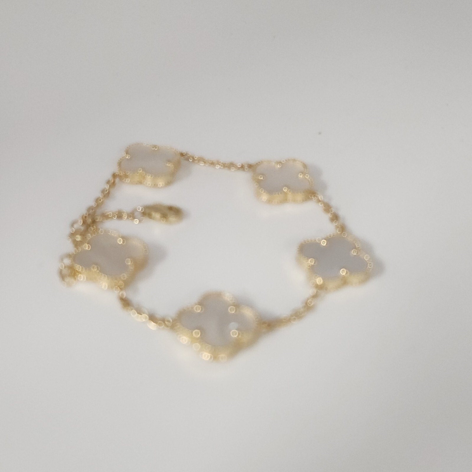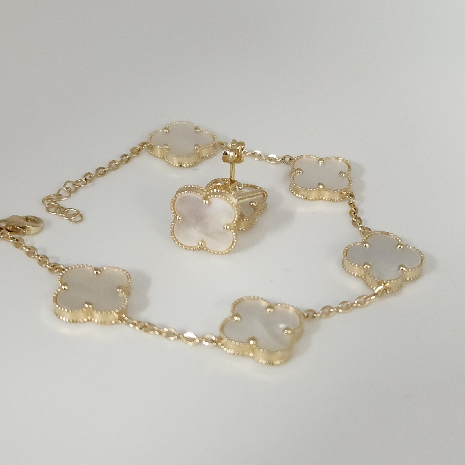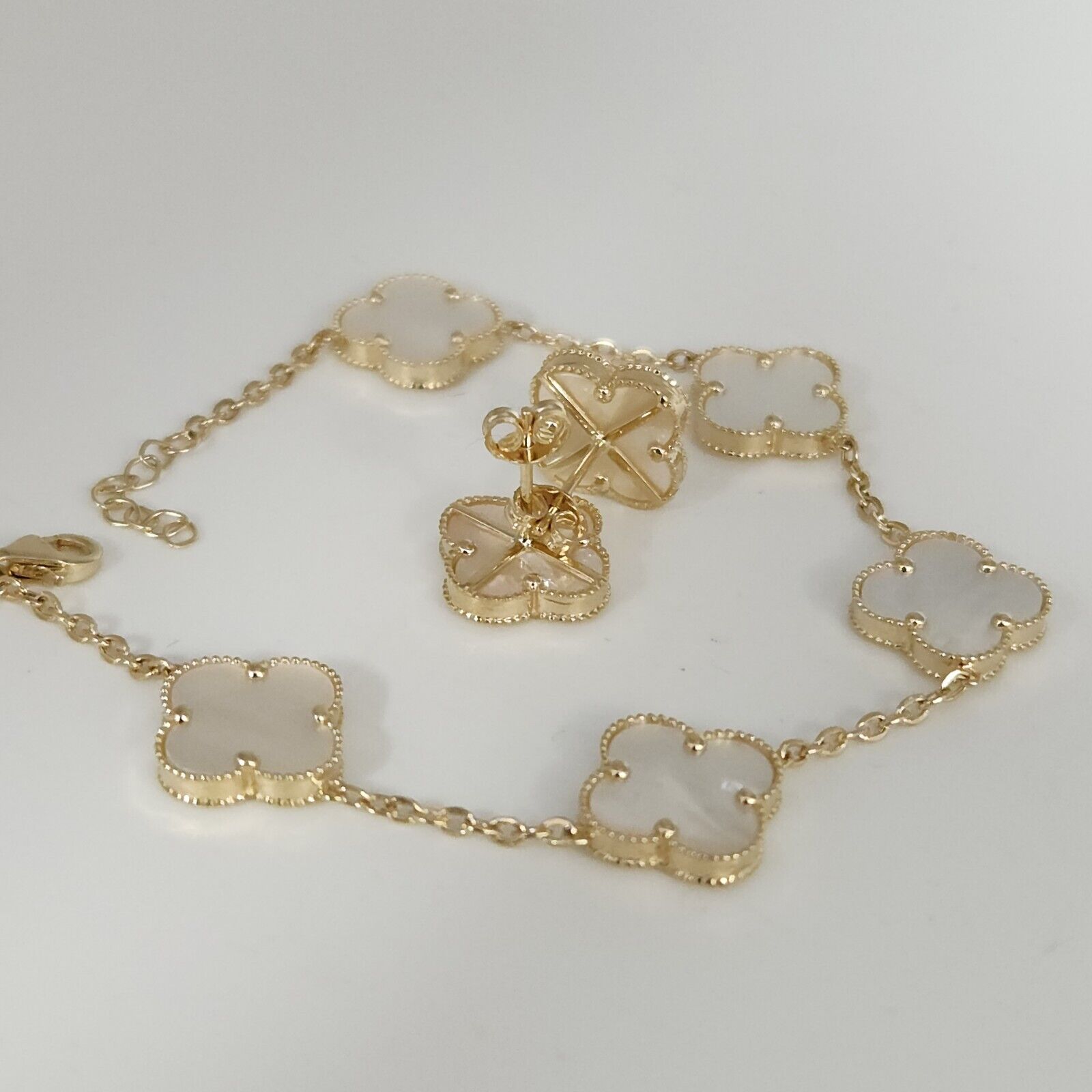 14k Yellow Gold Set Of Mother Of Pearl Flowers Bracelet 7.5" And Earrings