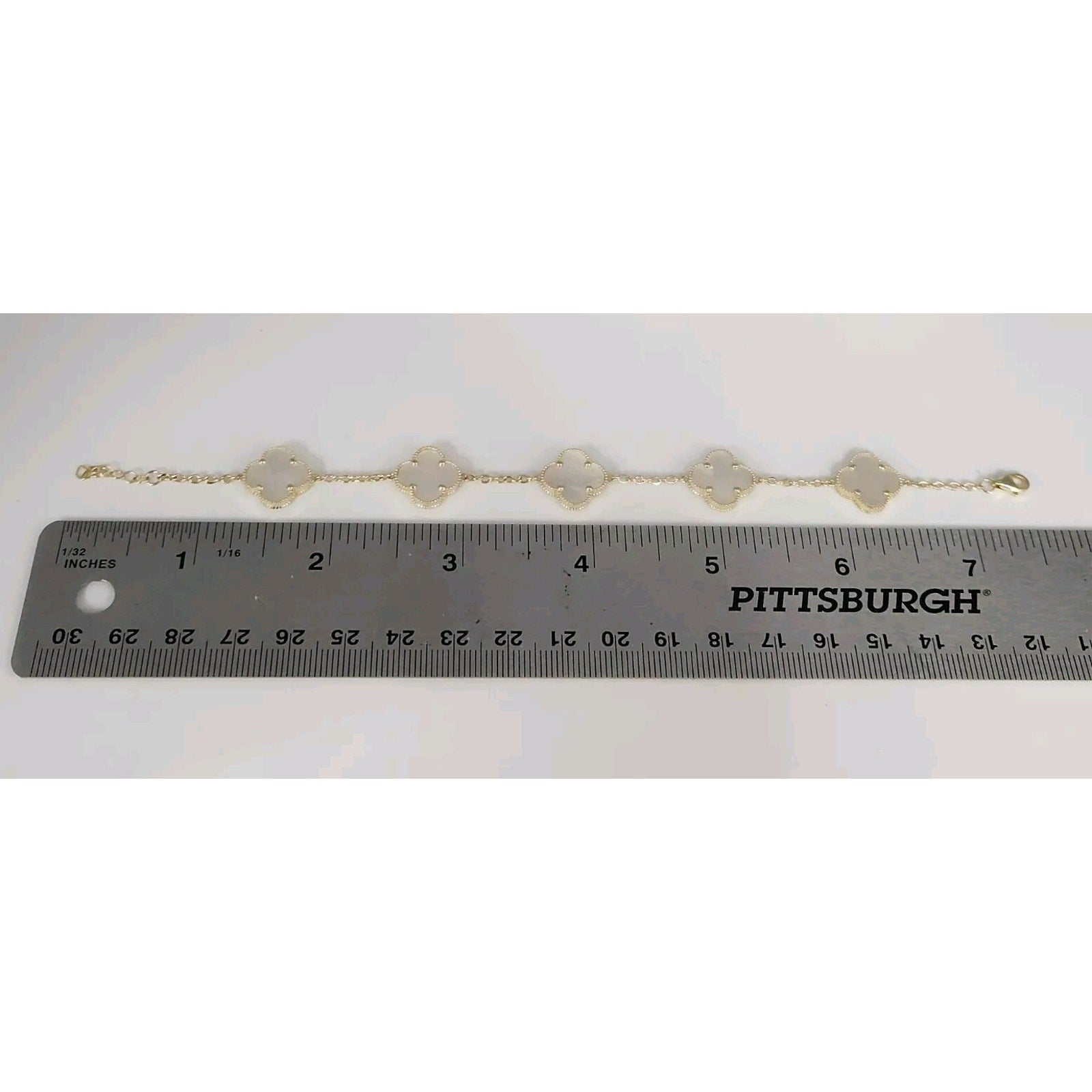 Add a touch of floral elegance to your jewelry collection with this stunning 14k yellow gold set. This set features a beautiful bracelet and matching earrings, both adorned with delicate mother of pearl flowers. The bracelet measures 7.5 inches in length, making it a comfortable fit for most wrists.