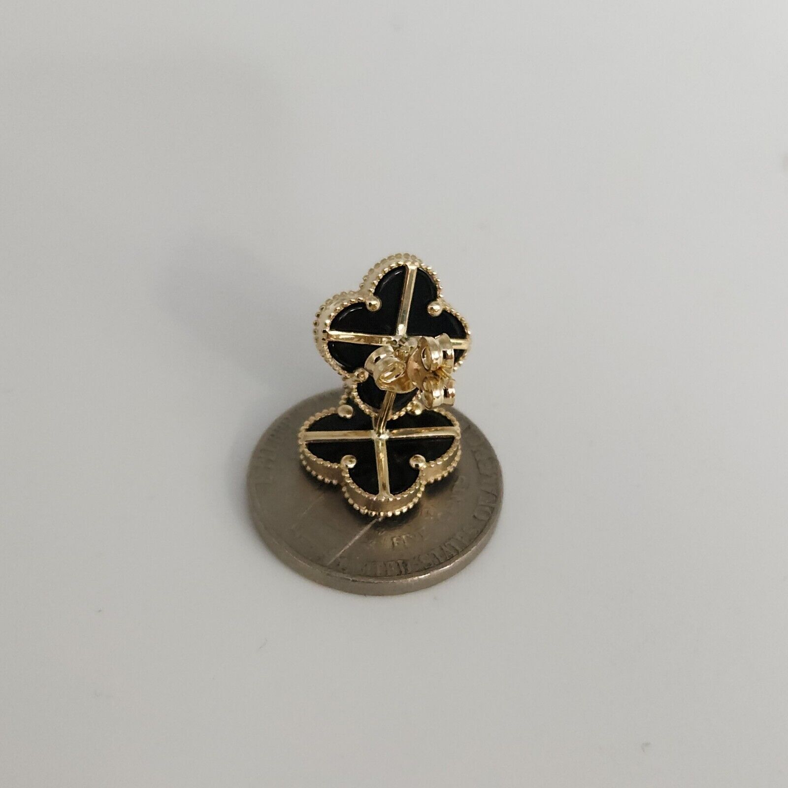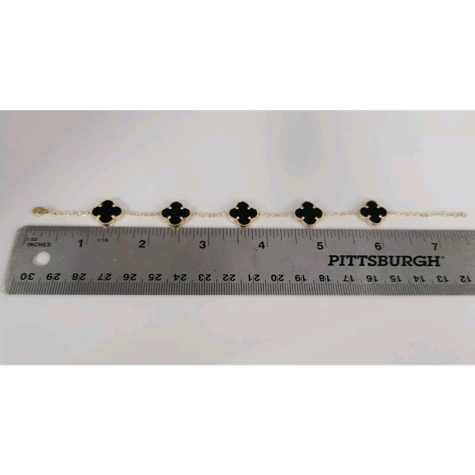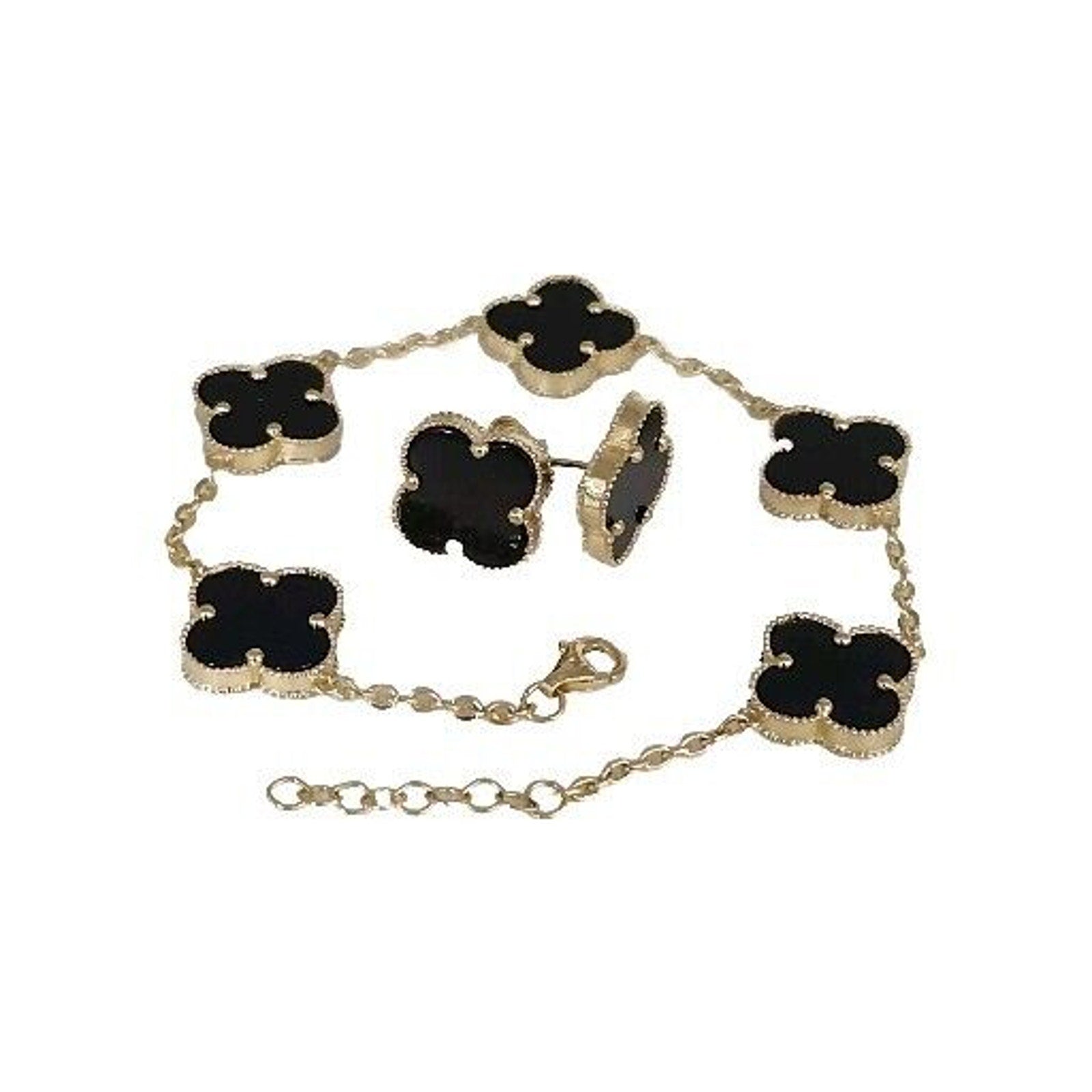 14k Yellow Gold Set Of Onyx Clover Flowers Bracelet 7.5" And Earrings