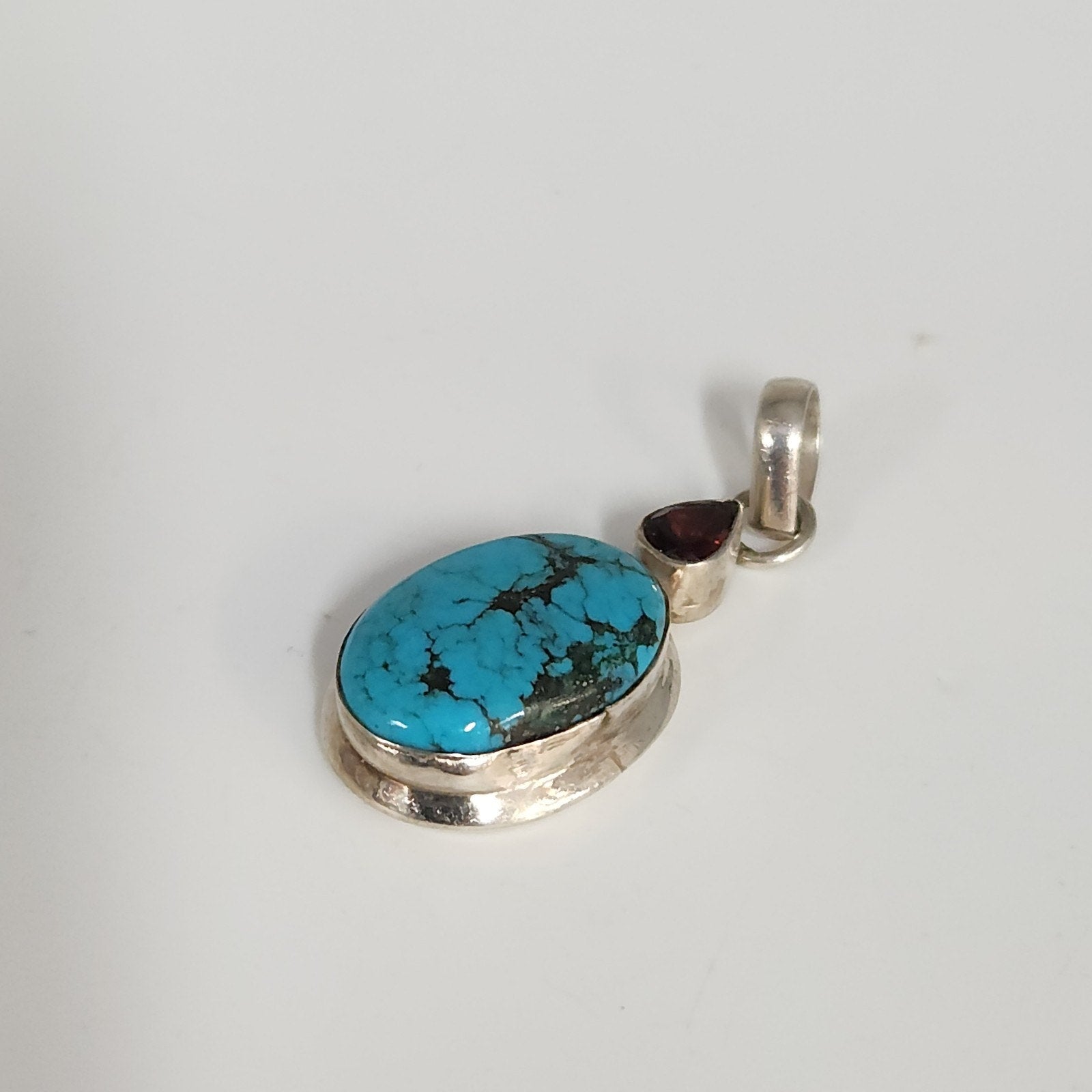 Artisan 925 Sterling Silver Pendant With Turquoise Stone & Garnet Teardrop
