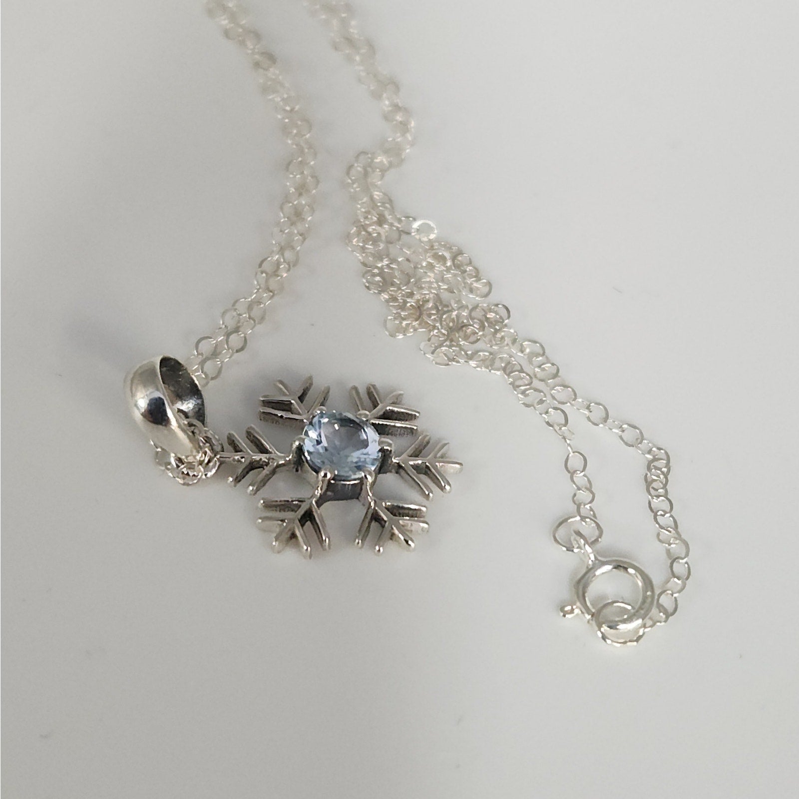 Delicate yet striking, this sterling silver snowflake necklace captures the beauty of winters quiet brilliance. A shimmering natural blue topaz rests at the heart of the snowflake reflecting light like freshly fallen ice. No two snowflakes are alike making this piece a subtle reminder of individuality and Grace.