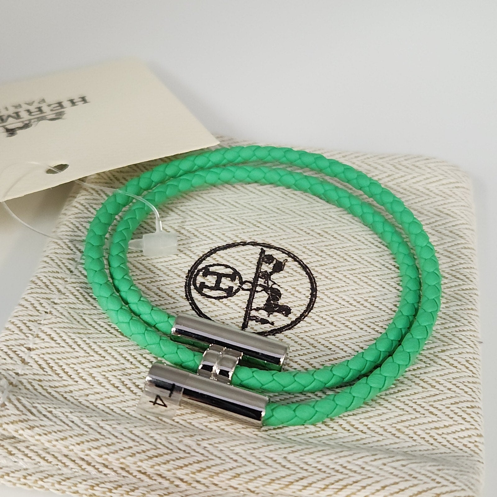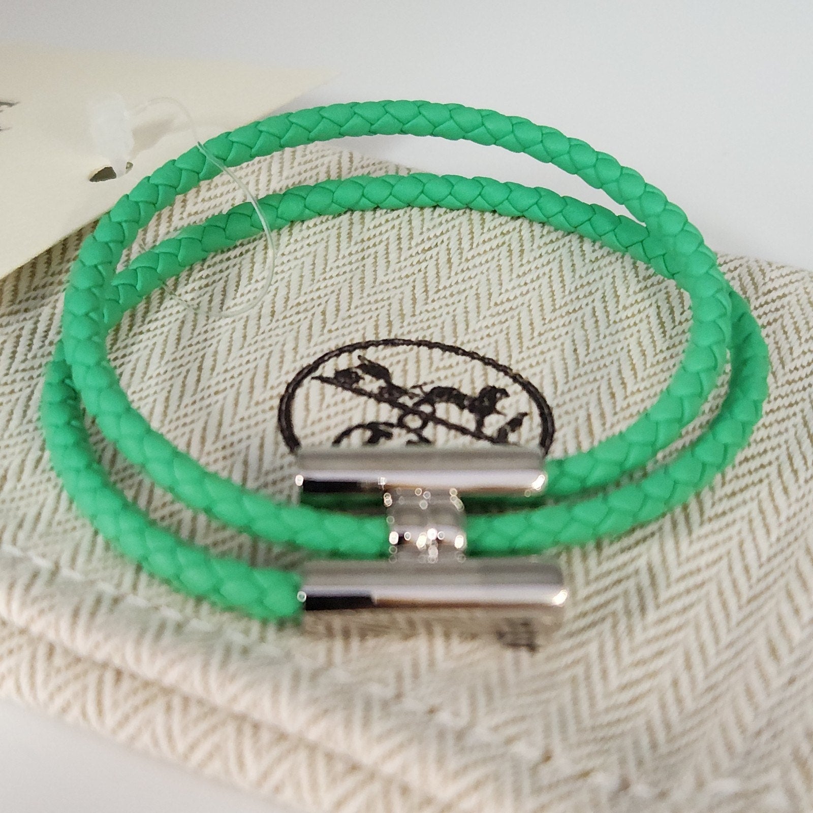 The New Hermes Green Tournis Tresse Bracelet is a luxurious and trendy piece of fashion jewelry from the renowned brand HERMÈS. This stylish bracelet features a vibrant green color and is made from high-quality calfskin leather, giving it a unique and elegant look. Perfect for adding a touch of sophistication to any outfit, this bracelet is a must-have accessory for any fashion-forward individual looking to elevate their style.