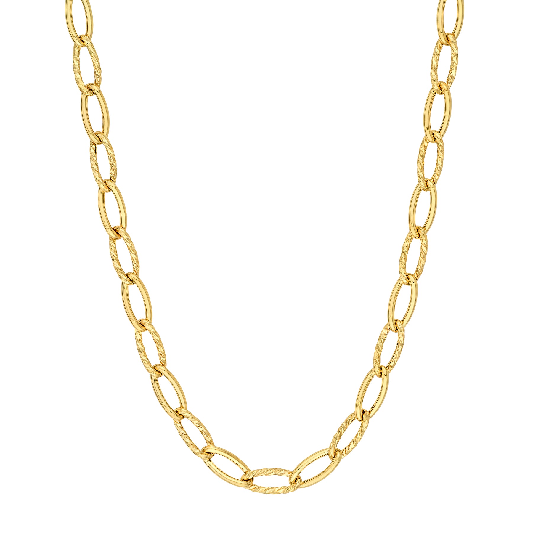 This Oval Twist Polished Links Chain features alternating smooth and twisted links, creating a dynamic, stylish design while securing with a pear shape lobster lock.